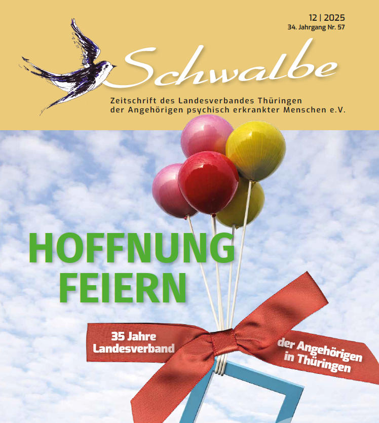 Seit Mitte Dezember ist die neue Ausgabe unserer Vereinzeitschrift verfügbar. Die Zeitschrift unter dem Titel "Hoffnung feiern" beinhaltet einen Rückblick auf die Feier unseres 35-jährigen Vereinsjubiläums am 09.11.2025 sowie Berichte von weiteren Veranstaltungen wie der Fachtagung "Mehr als Medikmente - Alternative Therapien psychischer Erkrankungen" sowie Erfahrungsberichte, Informationen von anderen relevanten Verbänden und Initiativen, Buch- und Filmrezensionen sowie einen Ausblick auf das Jahr 2026. Die ersten 3 Seiten mit Inhaltsverzeichnis finden Sie im pdf-Format hier.