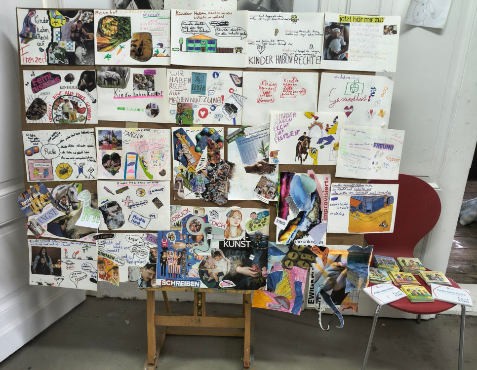 Parallel leiteten Jana Prochnow (Kunstschule) und Heike Stecklum Gesprächsrunden mit Kleingruppen, in denen den Kindern anhand von Poster, Kartenset und Pixi-Büchern das Thema Kinderrechte nahegebracht wurde. Die Kinder öffneten sich zunehmend und berichteten über erlebte Missachtung und Verletzung ihrer Kinderrechte, z.B. durch Gewalterfahrungen und Vernachlässigung. In ihren Diskussionen entwickelten sie Forderungen und Ideen, die kreativ in Collagen verarbeitet wurden, sodass ein vielfältiges eigenes Poster entstand.