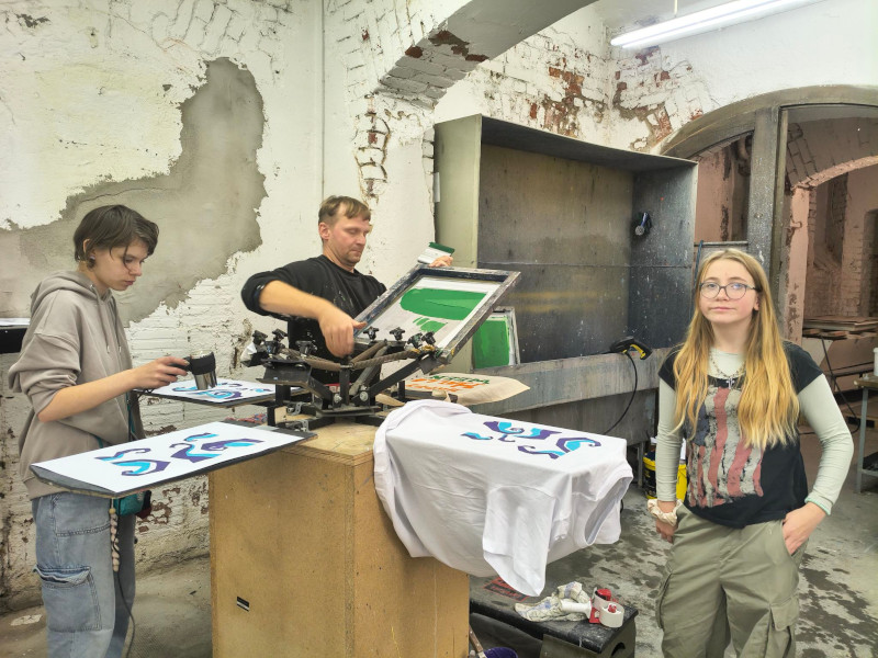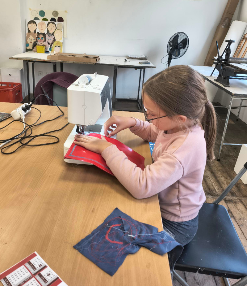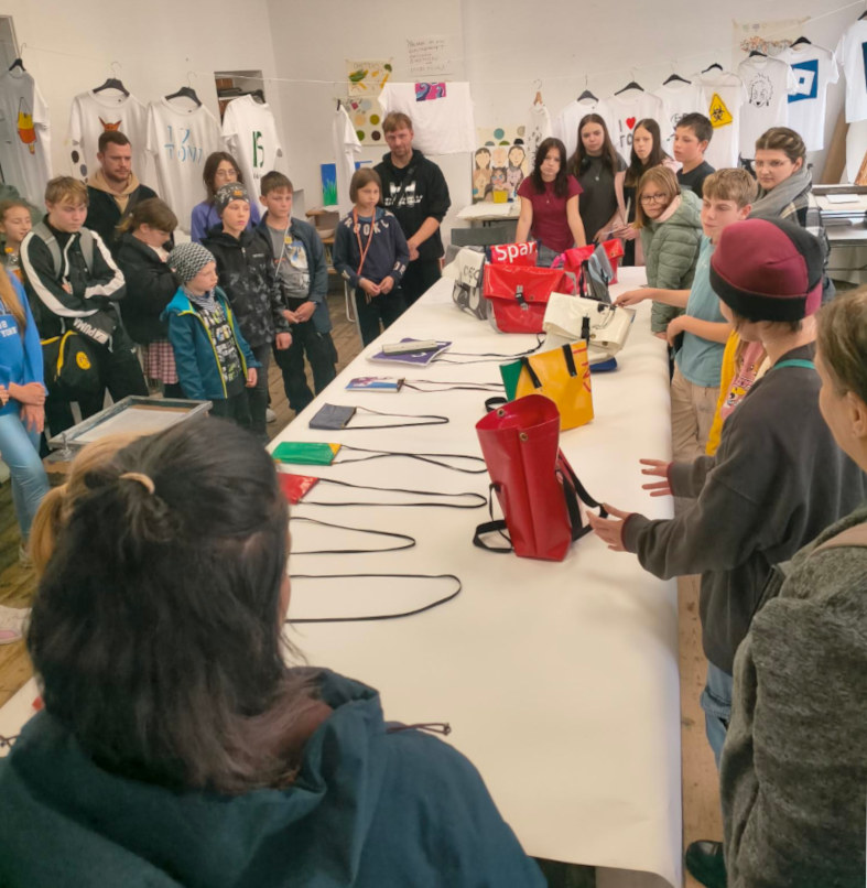 An den ersten zwei Tagen standen Siebdruck und Taschen-Nähen auf dem Programm. Unter der Leitung von Thomas Prochnow entwarfen die Kinder fantasievolle Motive und Vorlagen, die sie dann auf T-Shirts und Papier druckten. Bei Bianca Freundel wurden die Kinder in den Umgang mit der Nähmaschine eingeführt und nähten aus recycelten Kunststoffplanen bunte Taschen nach ihren Vorstellungen.