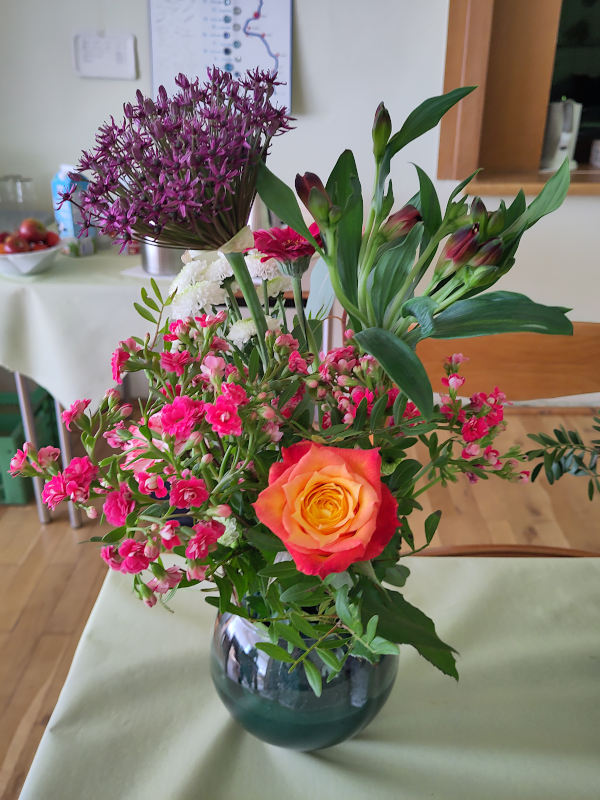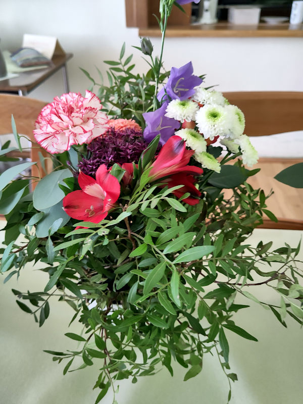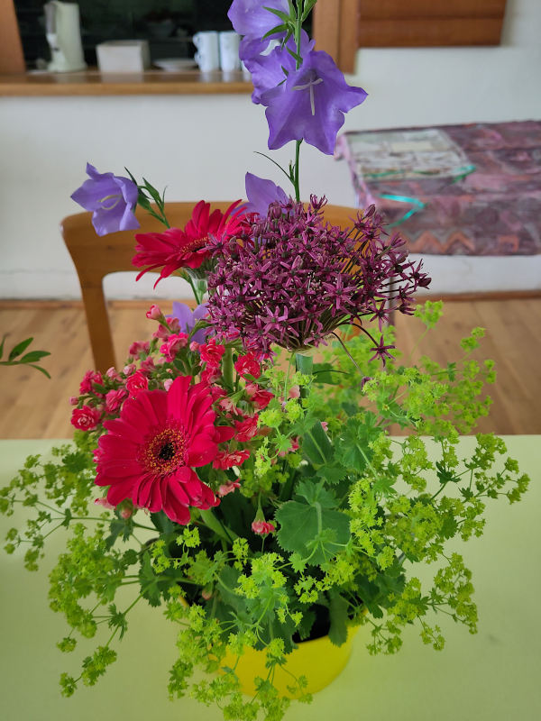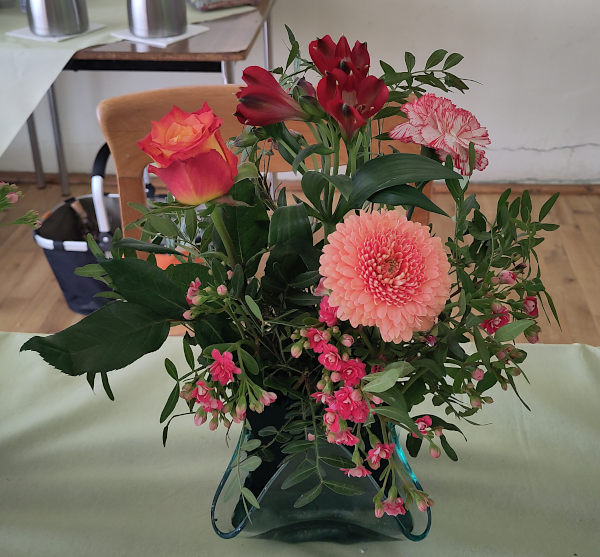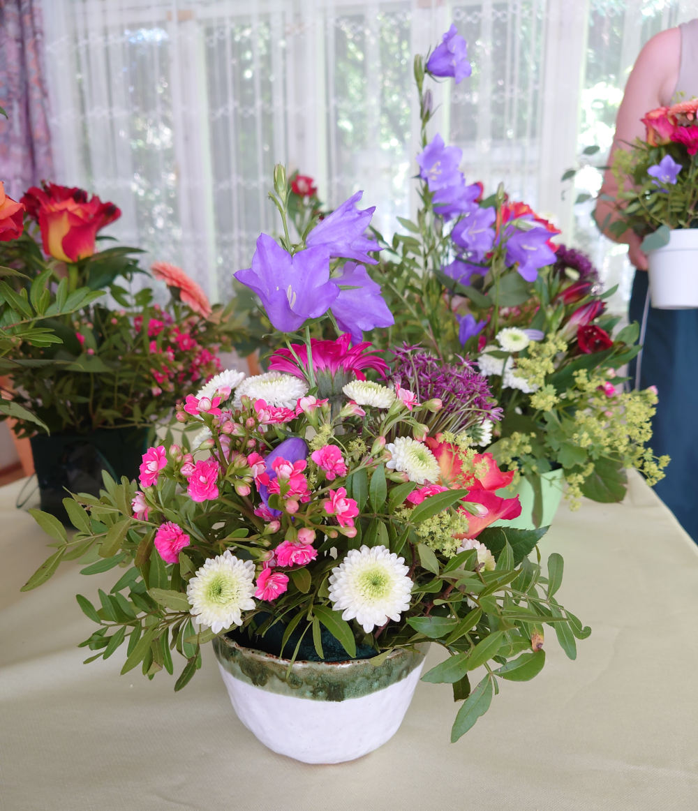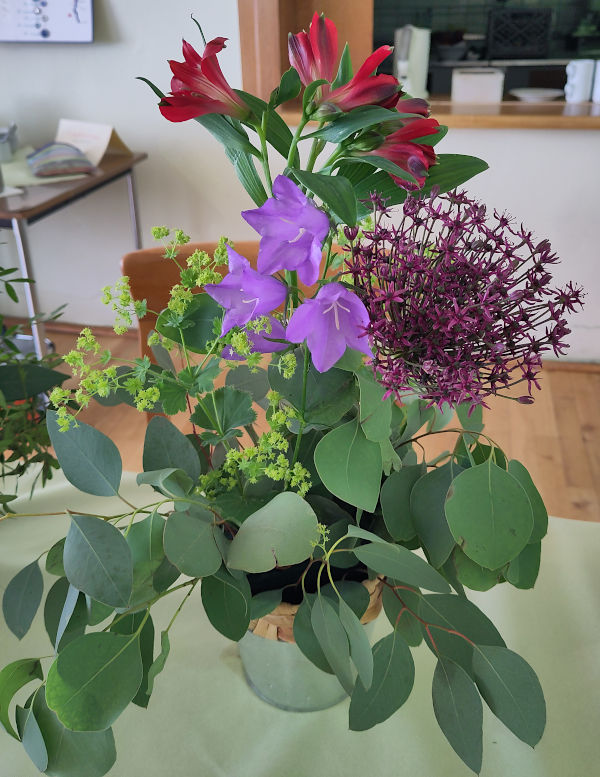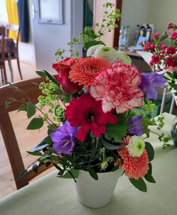 Nach der Mittagspause und dem informellen Austausch untereinander konnte an den begonnen Werken weitergebastelt und zusätzlich ein ganz individuelles Blumengesteck mit Unterstützung der Floristin Yvonne Täubert kreiert werden. Es war spannend zu verfolgen, wie unterschiedlich dann die Ergebnisse waren, obgleich doch alle die gleichen Ausgangsmaterialien hatten.