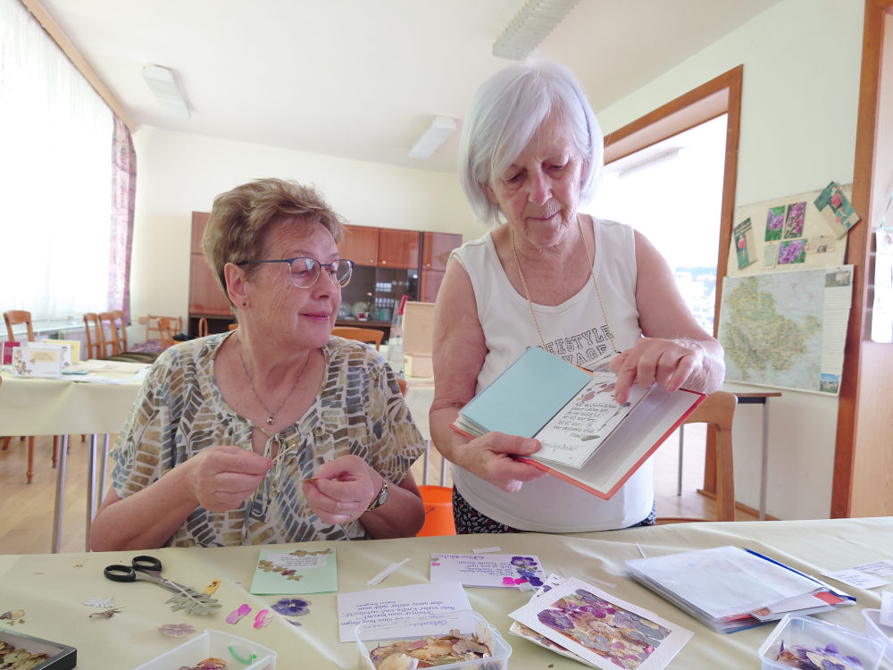 Eine Gruppe gestaltete Grußkarten mit getrockneten Trockenblumen unter Anleitung von Reingart Fischer. Sie stellte ihren großen Fundus an getrockneten Blüten, Blättern und Gräsern aber auch an Gedichten und Sprüchen sowie verschiedenen Papiere zur Verfügung. Nachdem der passende Text ausgewählt war, ging es an die Gestaltung und besonders die filigranen Trockenblumen bedurften einer sehr geduldigen vorsichtigen Handhabung.
